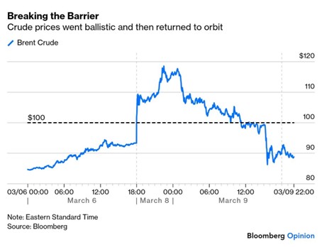 Tillkännagivandet kom efter att president Trump krävt Irans “villkorslösa kapitulation”, vilket bidrog till att oljepriset nådde nästan 120 dollar per fat i början av veckan. Aktiemarknaderna återhämtade sig därefter när oljepriserna föll på måndagen efter rapporter om att G7-länderna skulle diskutera en möjlig gemensam frigörelse av strategiska reserver. President Trump sade senare att han skulle häva oljerelaterade sanktioner, ge tankfartyg eskort av den amerikanska flottan genom Hormuzsundet och förutspådde att kriget skulle ta slut “mycket snart”. Dessa utvecklingar gjorde att Brentolja stängde måndagen under 99 dollar, vilket markerade det största fallet någonsin från en intradagstopp till stängningskurs (se graf).