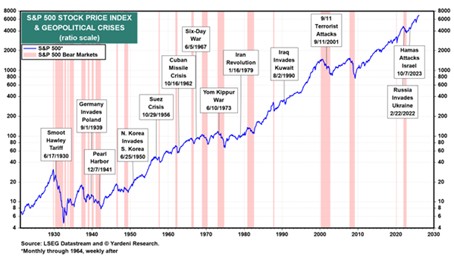 Det är dock värt att påpeka att även mer långvariga geopolitiska konflikter tenderar att ha begränsade långsiktiga negativa konsekvenser för aktiemarknaderna, och att större händelser som orsakar betydande korrigeringar är relativt sällsynta. Ett visst undantag är björnmarknaden efter Yom Kippur-kriget 1973, även om detta störde den globala oljeförsörjningen vid en tidpunkt då inflationen redan steg och marknaderna var mer sårbara för en oljeprischock än vad de är i dag.