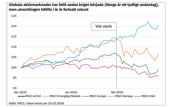Osäkerheten har lett till fortsatt volatilitet på de flesta finansmarknader, eftersom investerare har försökt tolka motstridiga nyheter och blandade signaler om konflikten. Aktier har pendlat sedan kriget bröt ut, och globala aktier är omkring 5 % lägre i lokal valuta sedan början av mars, med Europa (-7 %) och tillväxtmarknader (-6 %) som hårdast drabbade. USA (-4 %) har klarat sig relativt bättre, medan Norge (+7 %) har gynnats av högre oljepriser och nyligen nådde en rekordnivå. VIX, även kallat aktiemarknadens skräckindex, är lägre än i början av månaden, men ligger fortfarande över 20, vilket typiskt indikerar förhöjd marknadsstress.