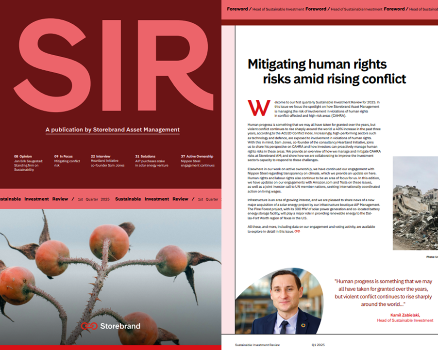 I det här numret sätter vi fokus på hur Storebrand Asset Management hanterar risken för inblandning i kränkningar av mänskliga rättigheter i konfliktdrabbade områden och högriskområden (CAHRA).